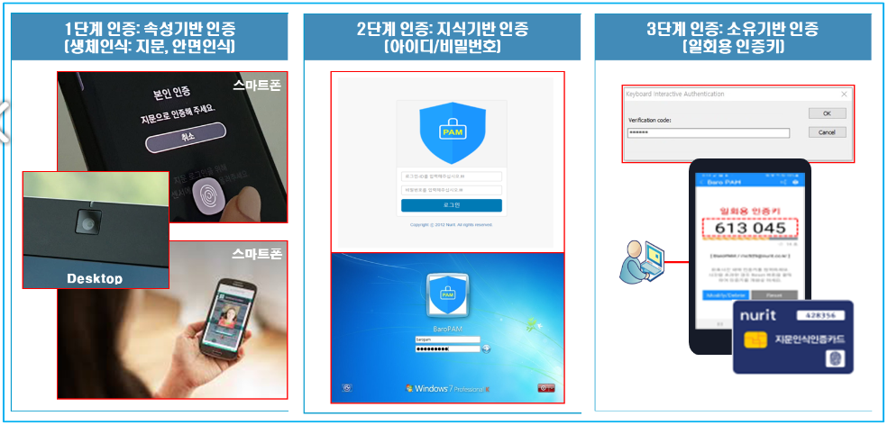 1단계 인증은 지문·안면인식 등 속성을 기반으로 한 생체인식, 2단계 인증으로 아이디(ID)와 패스워드(PW) 등을 이용한 지식기반 인증, 3단계로 일회용 인증키를 이용한 소유기반 3단계 인증방식이다.