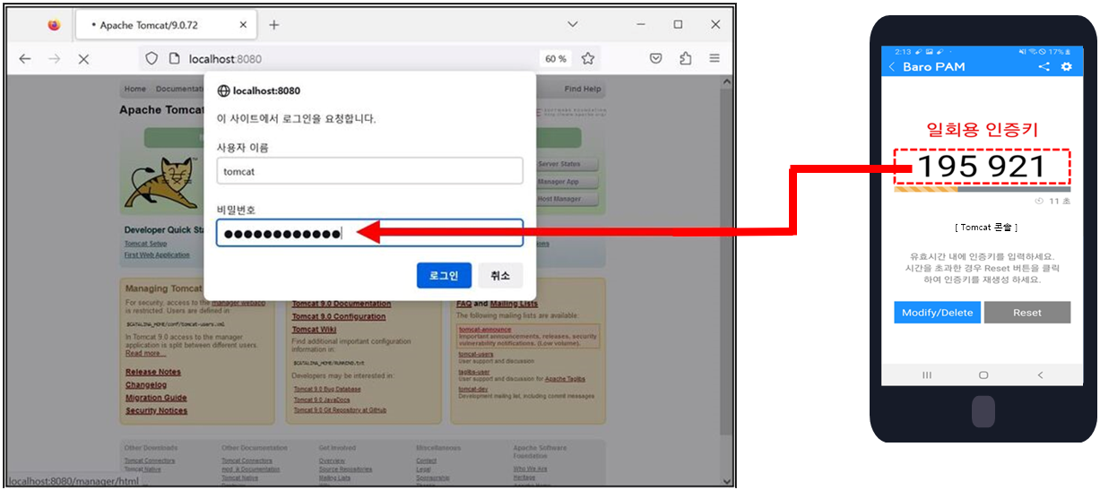 예를 들어, 비밀번호가 "tomcat" 이고, 일회용 인증키가 "195921" 이라면 "tomcat195921"으로 입력한다.