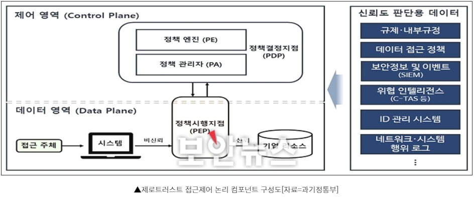안전하고 지속적인 접근제어를 위해서 제로트러스트 보안모델은 ‘제어영역’과 ‘데이터 영역’으로 구분되어야 하며, 자원에 대한 접근 요구가 있을 때 접속을 결정하는 정책결정지점(PDP)과 접속을 시행하는 정책시행지점(PEP)을 두고 운영해야 한다.