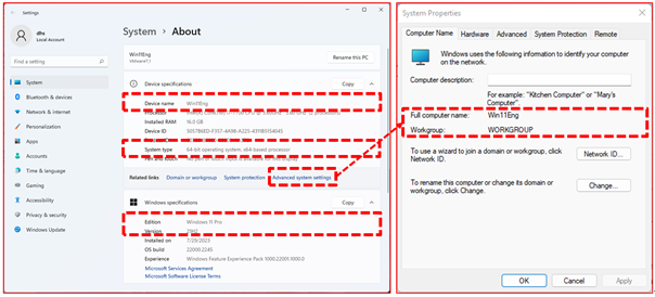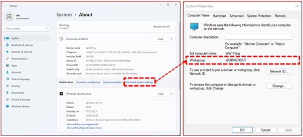 Note) To check the workgroup, right-click the "Windows Start" image -> click "System" -> click "Advanced system settings" -> check "Workgroup" on the "System Properties" screen.