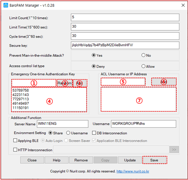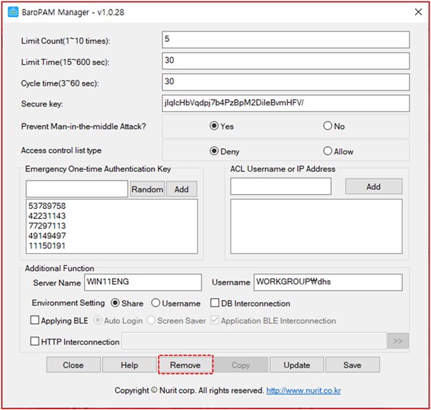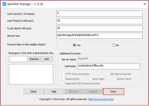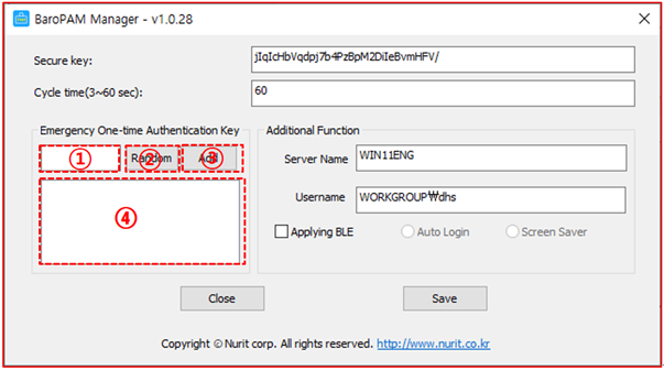 If BLE(Bluetooth Low Energy) is used, if the set server name and the server name registered in the BaroPAM app, which is a OTA key generator, are different, automatic logon of Windows and screen saver lock prevention/automatic lock/automatic unlock The function does not work normally