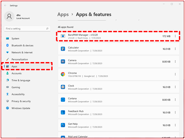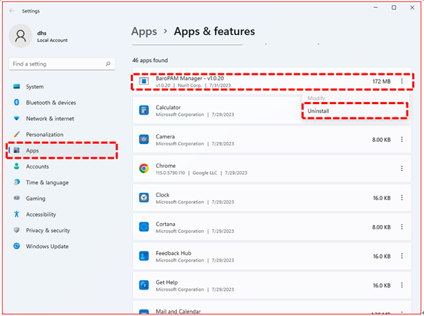 Third, on the "App & features" screen, select "BaroPAM Manager" to delete as follows and click the "Uninstall" button to delete "BaroPAM".