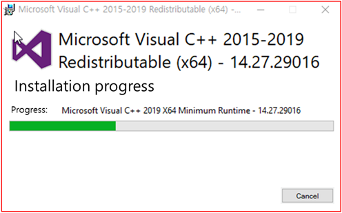 Second, on the "Microsoft Visual C++ 2015-2019 Redistributable (x64) - …" installation screen, after checking the "MICROSOFT Software License Terms", select "Agree(A)" and click the "Install(I)" button to see the following The same "Installation Progress" screen appears.