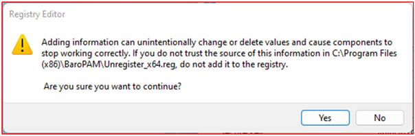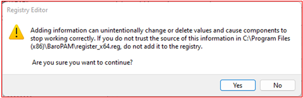 Third. If you click the "Yes" button on the above screen, the following "Registry Editor" screen appears to register BaroPAM in the Windows registry.