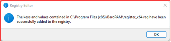 If you click the "OK" button on the screen above, the following message appears after BaroPAM's registration in the registry is completed.