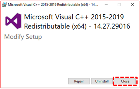 If it is already installed, the following "Microsoft Visual C++ 2015-2019 Redistributable (x64) - …" installation modification screen appears.