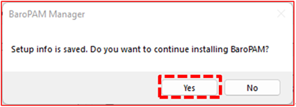 If you select the "Yes" button, the settings in the "BaroPAM Manager" screen are saved, the "BaroPAM Manager" screen is closed, and the BaroPAM installation process proceeds.