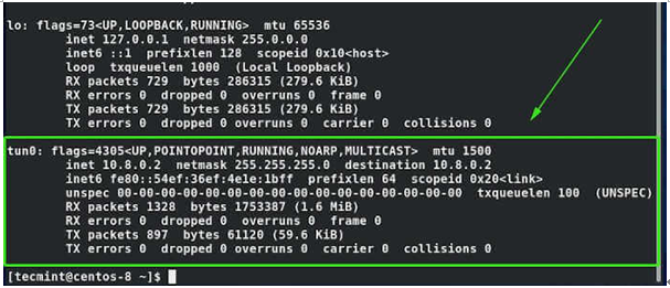 앞서 언급한 바와 같이 이것은 SSL 터널을 통해 모든 트래픽을 OpenVPN 서버로 안전하게 터널링하는 인터페이스이다. 인터페이스는 VPN 서버에 의해 동적으로 IP 주소가 할당된다. 보시다시피 OpenVPN 서버에서 클라이언트 Linux 시스템에 10.8.0.2의 IP 주소를 할당했다.