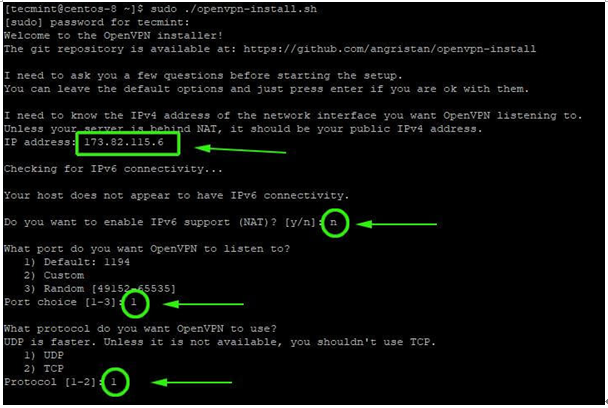 6. 먼저 서버의 공용 IP 주소를 제공하라는 메시지가 표시된다. 그 후에는 기본 포트 번호(1194) 및 사용할 프로토콜(UDP/TCP)과 같은 기본 옵션을 사용하는 것이 좋다.