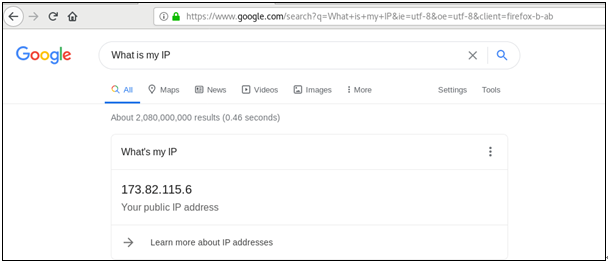 클라이언트 시스템이 VPN의 공개 IP를 선택하여 실제로 OpenVPN 서버에 연결되어 있음을 확인했다. 또는 브라우저를 실행하고 Google 검색 "What's my IP"를 실행하여 공개 IP가 OpenVPN 서버의 IP로 변경되었는지 확인할 수 있다.