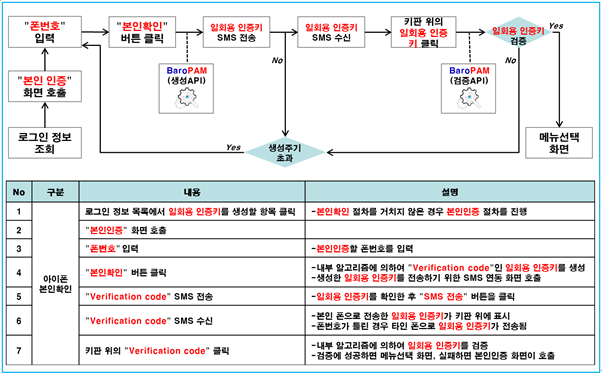 또한, 타인의 폰번호를 부정으로 사용하지 못하도록 하기 위해서 별도의 본인확인 기능을 적용할 필요가 있는데, "BaroPAM" 앱에서는 자체 알고리즘을 적용하여 자체적으로 본인확인 절차를 실행하고 있다.