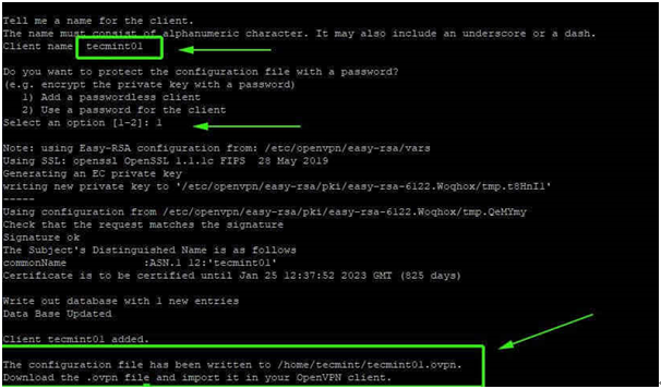 클라이언트 이름을 입력하고 기본 선택 항목을 사용하기만 하면 된다. 클라이언트 파일은 .ovpn 파일 확장자로 홈 디렉터리에 저장된다.