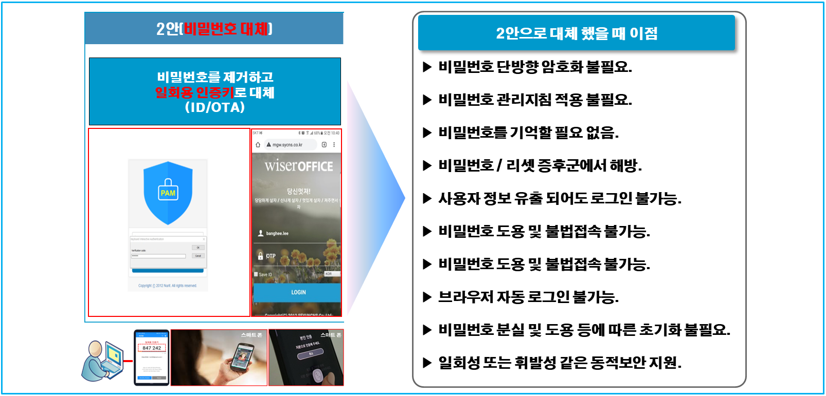 결론은 정보자산 로그인 시 비밀번호 만으로는 결코 안전하지 않으며 매번 사용할 때마다 비밀번호를 대체할 수 있는 새로운 적용 방안(추가 인증, 비밀번호 대체, 새로운 비밀번호)이 필요하다.