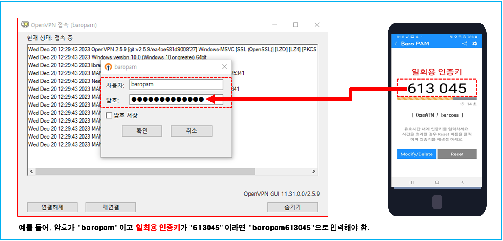 OpenVPN의 보안 강화를 위하여 로그인 화면에서 "사용자"를 입력하고, 암호가 "baropam"이고, BaroPAM 앱에서 생성한 인증 코드인 "613045"이라면 비밀번호 프롬프트에 "baropam613045"을 입력한 후 하단의 "확인" 버튼을 클릭한다.