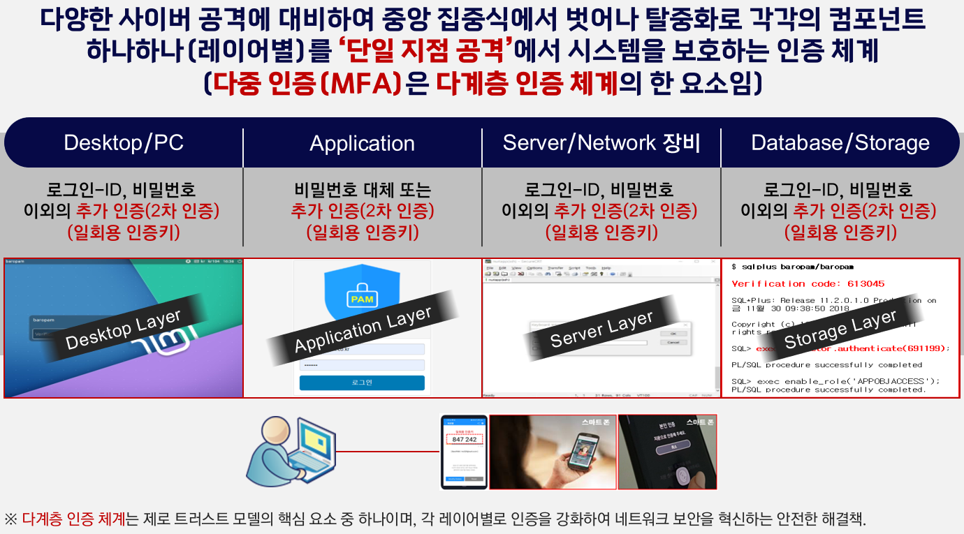 중앙 집중식에서 벗어나 탈중앙화하는 PC, 서버, 네트워크, 애플리케이션, 데이타베이스, 저장장치 등 각각의 레이어별 인증체계(다계층 인증 체계, Multi-layer authentication system)는 "단일 지점 공격"에서 시스템을 보호할 수 있다.