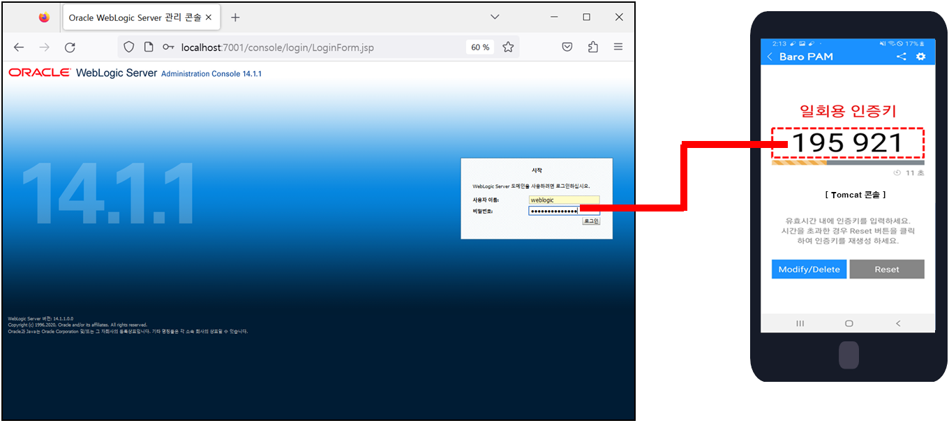 WebLogic 콘솔 로그인 화면에서 비밀번호를 먼저 입력하고 공백 없이 이어서 BaroPAM 앱에서 생성한 일회용 인증키를 입력해야 한다.
