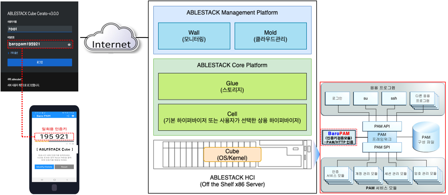 Able Cloud 관리콘솔 로그인 화면에서 암호를 먼저 입력하고 공백 없이 이어서 BaroPAM 앱에서 생성한 일회용 인증키를 입력하면 된다.