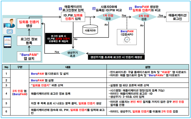 또한, 타인의 폰번호를 부정으로 사용하지 못하도록 하기 위해서 별도의 본인확인 기능을 적용할 필요가 있는데, "BaroPAM" 앱에서는 자체 알고리즘을 적용하여 자체적으로 본인확인 절차를 실행하고 있다.