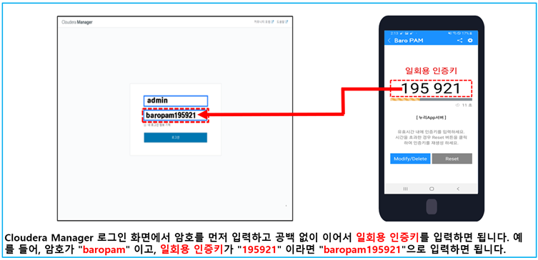 Cloudera Manager의 로그인 화면에서 Verification code의 "요청값"란에 "BaroPAM" 앱에서 생성한 일회용 인증키를 입력하기 위한 적용 절차는 다음과 같다.