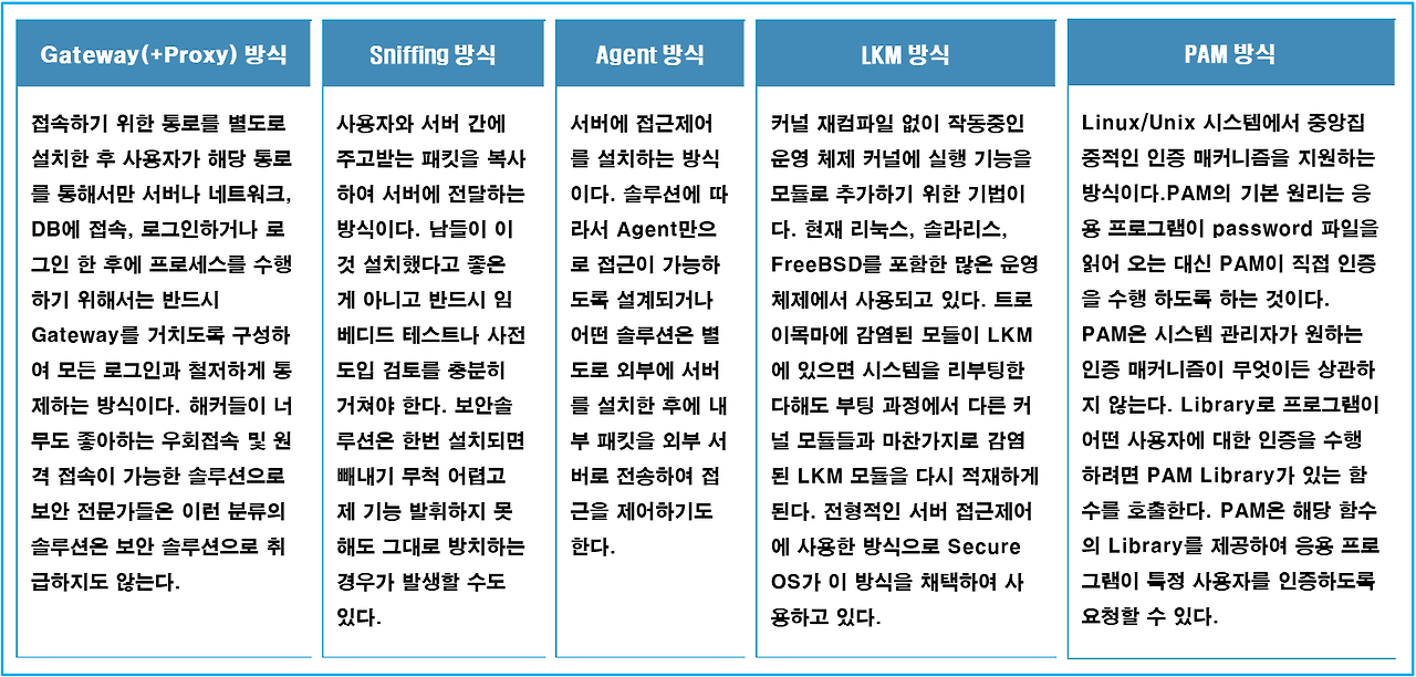 서버보안 S/W 적용방식에는 Gateway(+Proxy) 방식, Sniffing 방식, Agent 방식, LKM(Loadable Kernel Module) 방식, PAM(Pluggable Authentication Module) 방식 등이 있다.