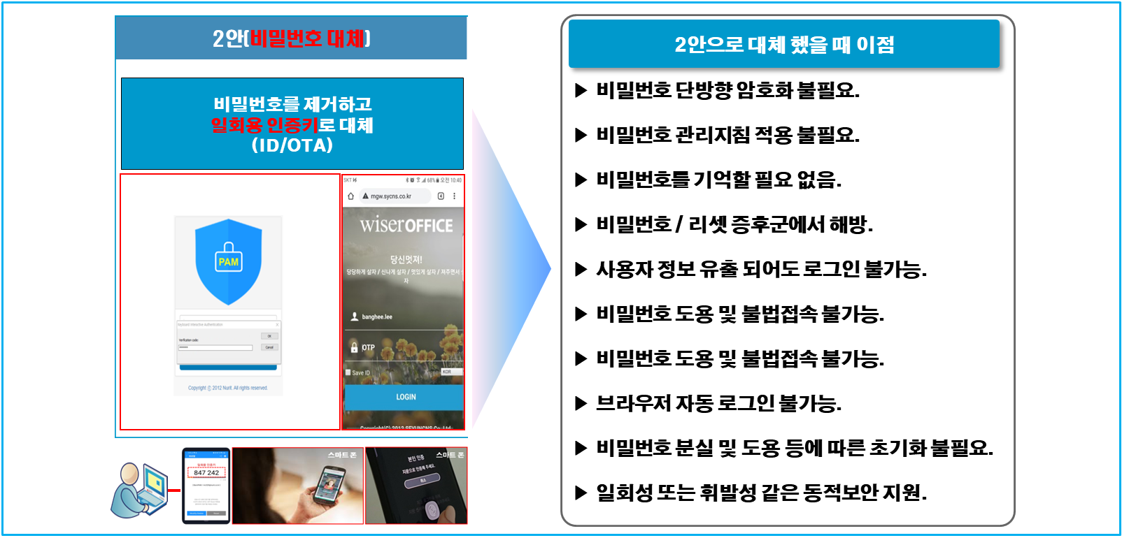 정보자산 로그인 시 비밀번호 만으로는 결코 안전하지 않으며 매번 사용할 때마다 비밀번호를 BaroPAM 같은 동적보안 솔루션인 일회용 인증키로 대체(적용방안 중 2안) 했을 때 이점은 다음과 같다.