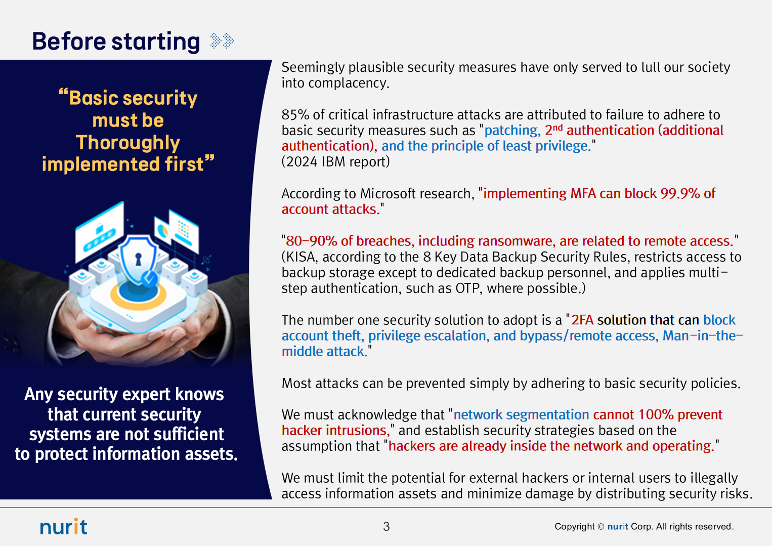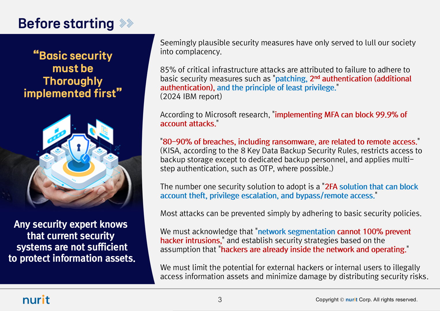 It appears that 85% of major infrastructure attacks occurred due to failure to maintain basic levels of security such as patches, 2nd authentication (additional authentication), and the principle of least privilege. (2024 IBM Report)