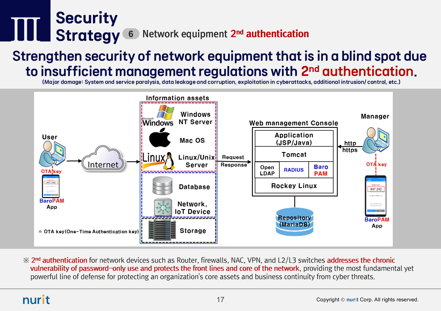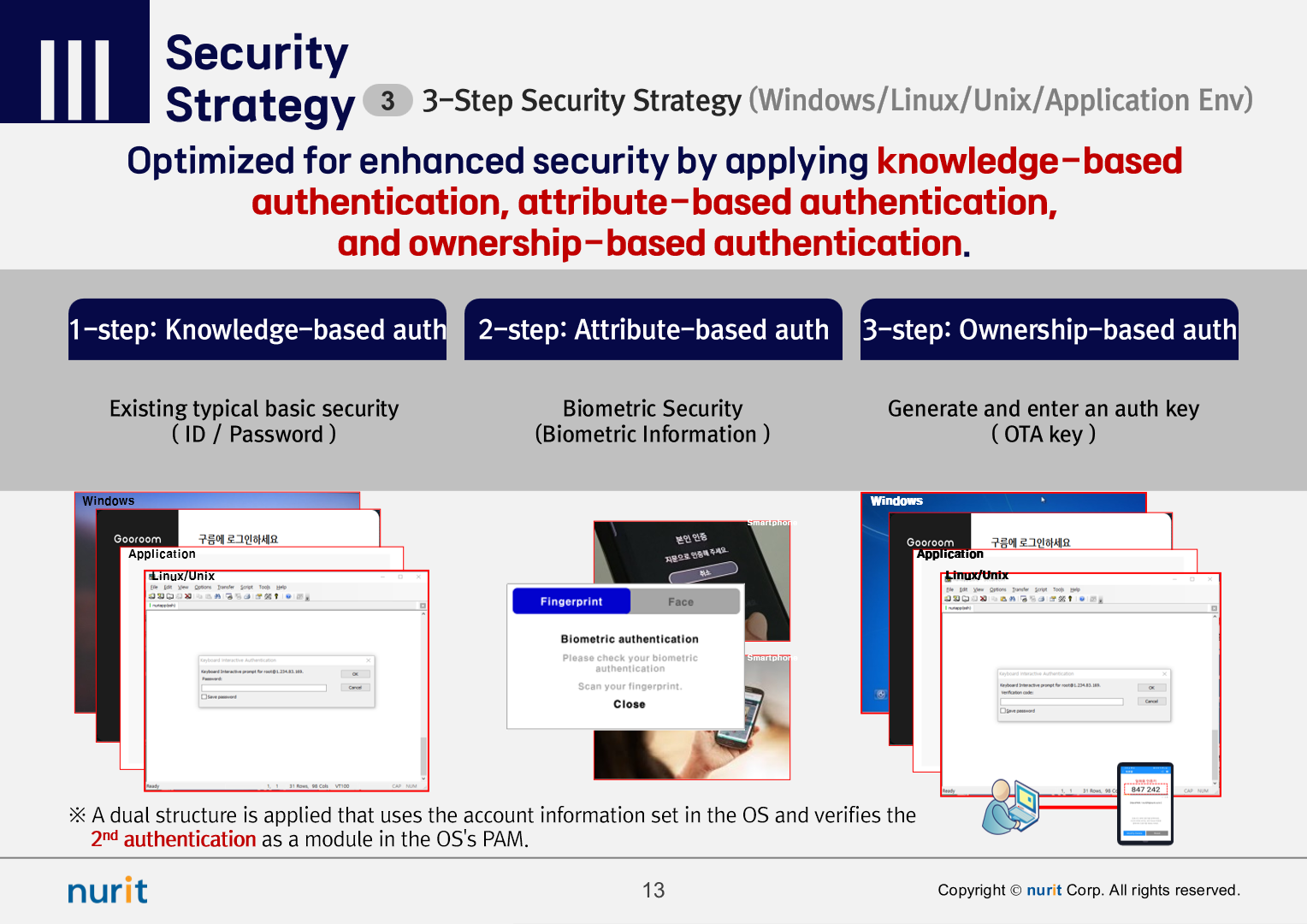 To strengthen security, the order of applying 2nd authentication that supports a multi-layer authentication system is first the operating system (OS), second the administrator account or management console, and third the general user account.