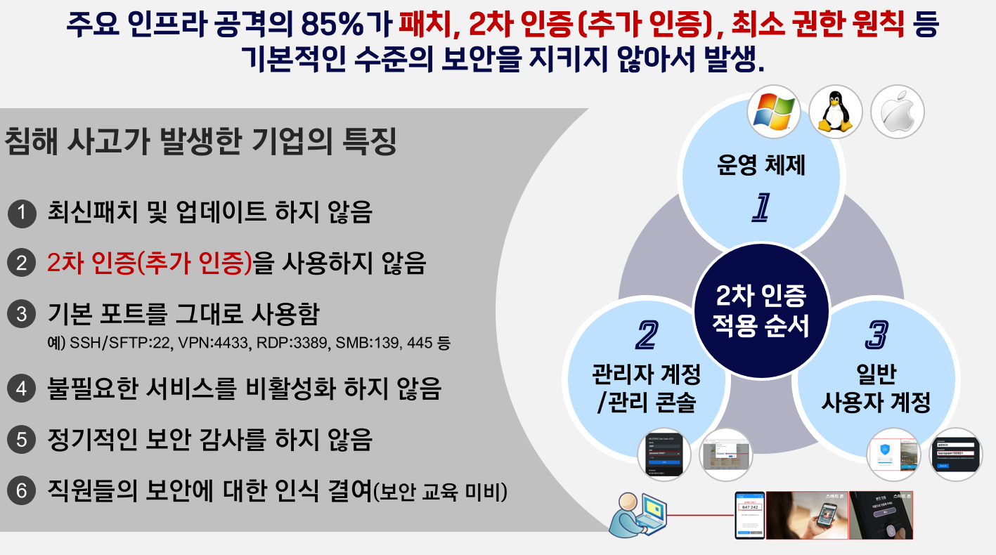 침해 사고의 1순위인 계정도용, 권한상승, 우회/원격 접속을 차단할 수 있는 것은 2차 인증이다.
