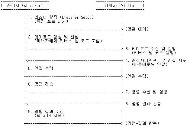 일반적인 쉘 접속 방식과는 반대로, 피해자 시스템이 공격자 시스템으로 연결을 시도하고, 공격자 시스템이 그 연결을 받아들여 쉘 세션을 생성하는 방식이다.