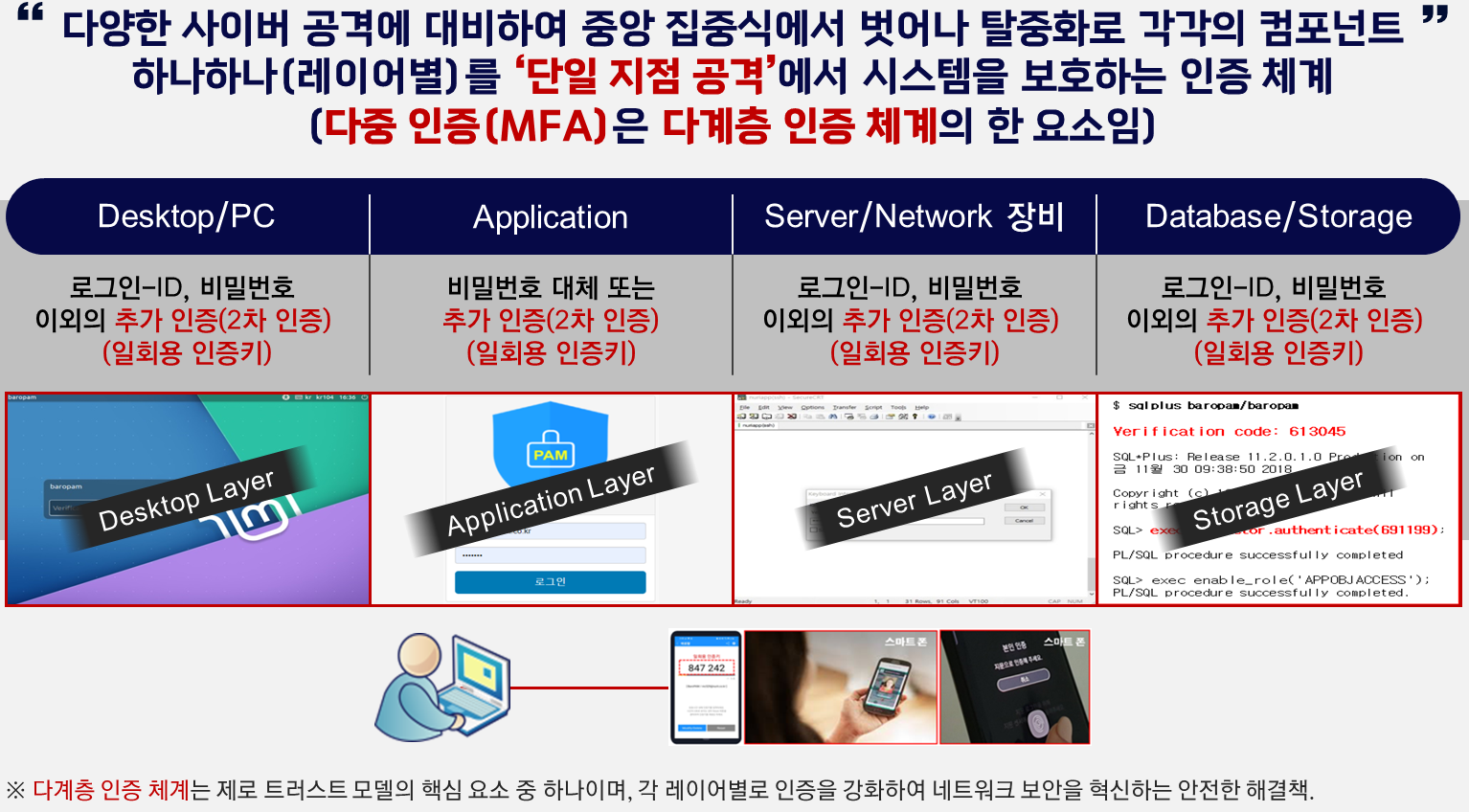 기존의 중앙 집중식 인증 방식에서 벗어나, PC, 서버, 네트워크, 애플리케이션, 데이터베이스, 저장장치 등 다양한 IT 인프라의 각 구성 요소(레이어)에 개별적인 인증 체계를 적용한다.