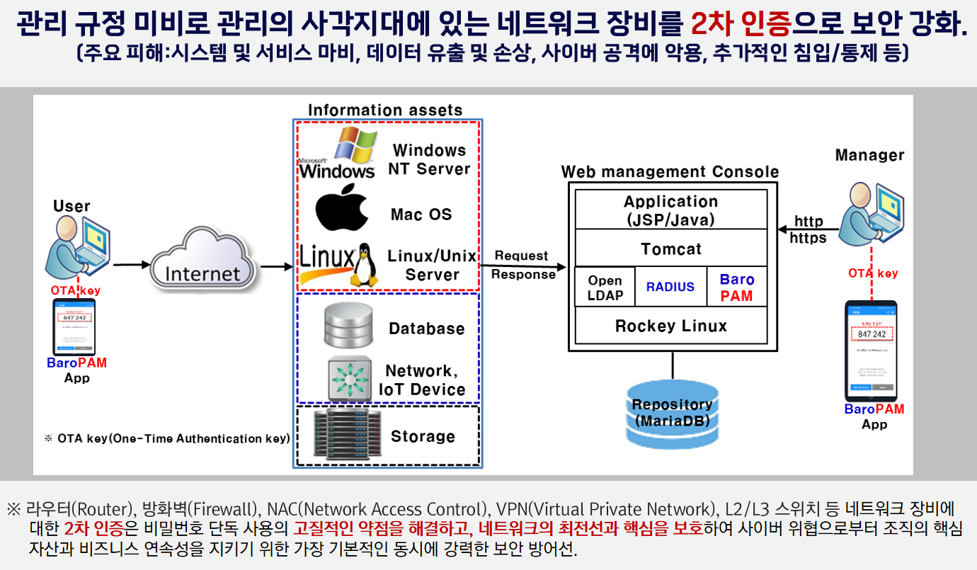 촘촘한 그물망처럼 다계층 인증 체계(Multi-Multi-layer authentication system)을 지원하는 BaroPAM은 RADIUS 서버에만 설치하면 된다.