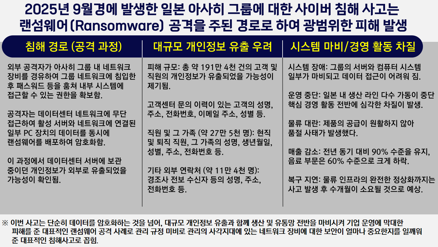 최근 일본 아사이 그룹은 네트워크 장비로 해커가 침투하여 네트워크 장비에 연결된 모든 서버와 PC에 랜섬웨어를 감염시킨 사건으로 두달째 시스템 마비, 생산라인과 물류가 정지된 사건이다.