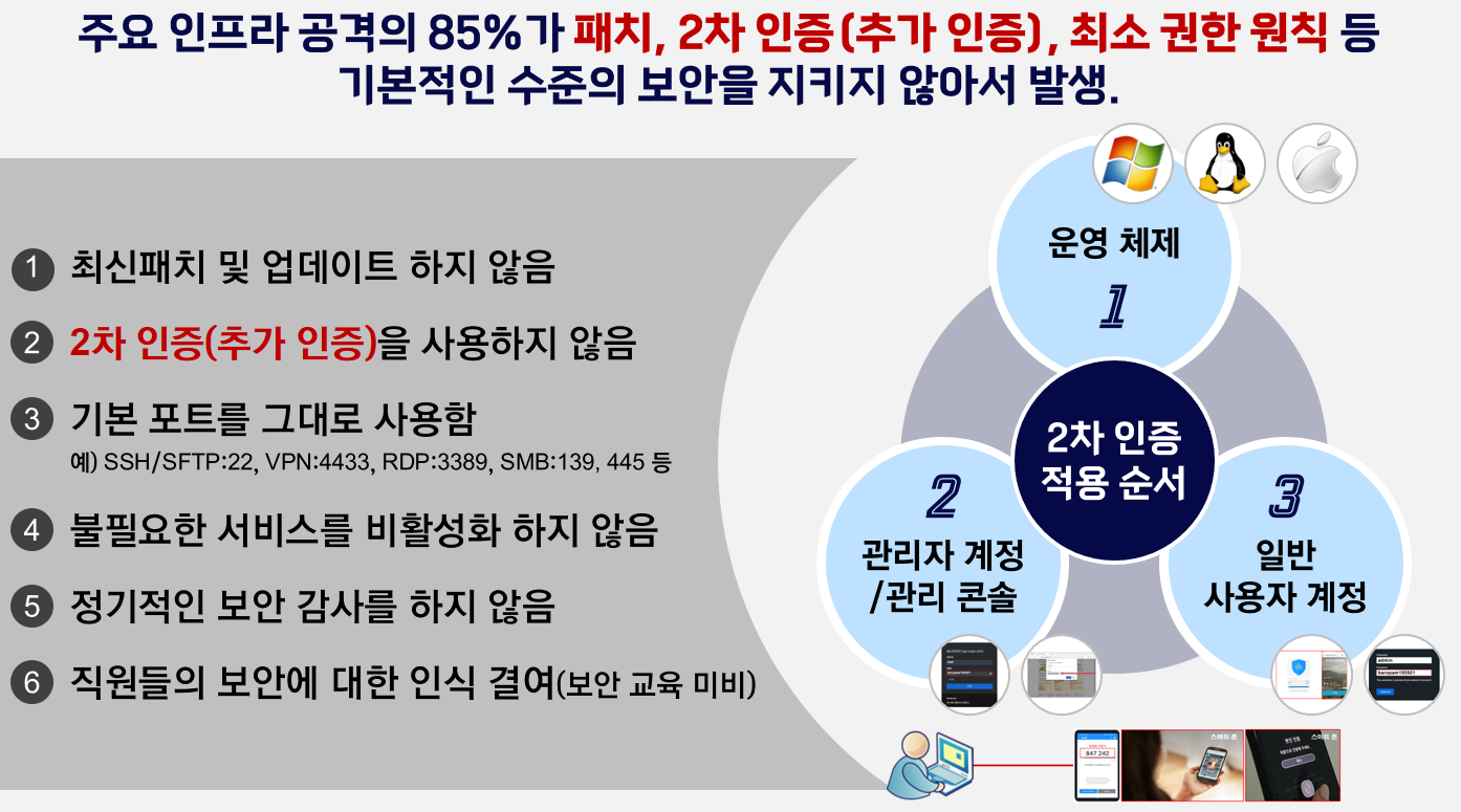 보안 솔루션 중 도입해야 할 1순위가 계정도용, 권한상승, 우회/원격접속, 중간자 공격을 차단할 수 있는 2차 인증 솔루션이다.